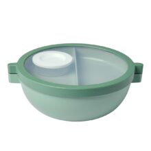 Miska Lunch Box ze szczelną pokrywą Vita 2.0 firmy Mepal. Miska Vita o pojemności 1500 ml, to świetne rozwiązanie dla każdego, kto chce zabrać swój ulubiony posiłek ze sobą do pracy, na uczelnie czy na wycieczkę. Kolekcja oferuje szeroką paletę kolorystyczną, obejmującą przyjemne, przykuwające wzrok kolory. Miska posiada dodatkowy, wyjmowany pojemnik typu bento oraz tackę, które świetnie oddzielają poszczególne składniki posiłków. Zyskujesz nowe możliwości kompozycji potraw, a mieszając dressing z sałatką tuż przed spożyciem, wszystkie składniki pozostaną chrupiące i świeże. Ogromnym atutem tego naczynia, jest zakręcana pokrywa, która jest bardzo szczelna. Zabierając miskę Vita w podróż, nie trzeba się obawiać o wylanie zawartości, a jedzenie zachowa swój aromat. Jest to również świetny wybór dla osób lubiących spożywać lunch na ciepło – jedzenie w misce Vita można podgrzewać w kuchence mikrofalowej, należy pamiętać jedynie, aby pokrywę w czasie podgrzewania luźno położyć na misce. Jest łatwa w utrzymaniu czystości — nadaje się do mycia w zmywarce, a dodatkowy pojemnik można w łatwy sposób wyjąć i wyczyścić.