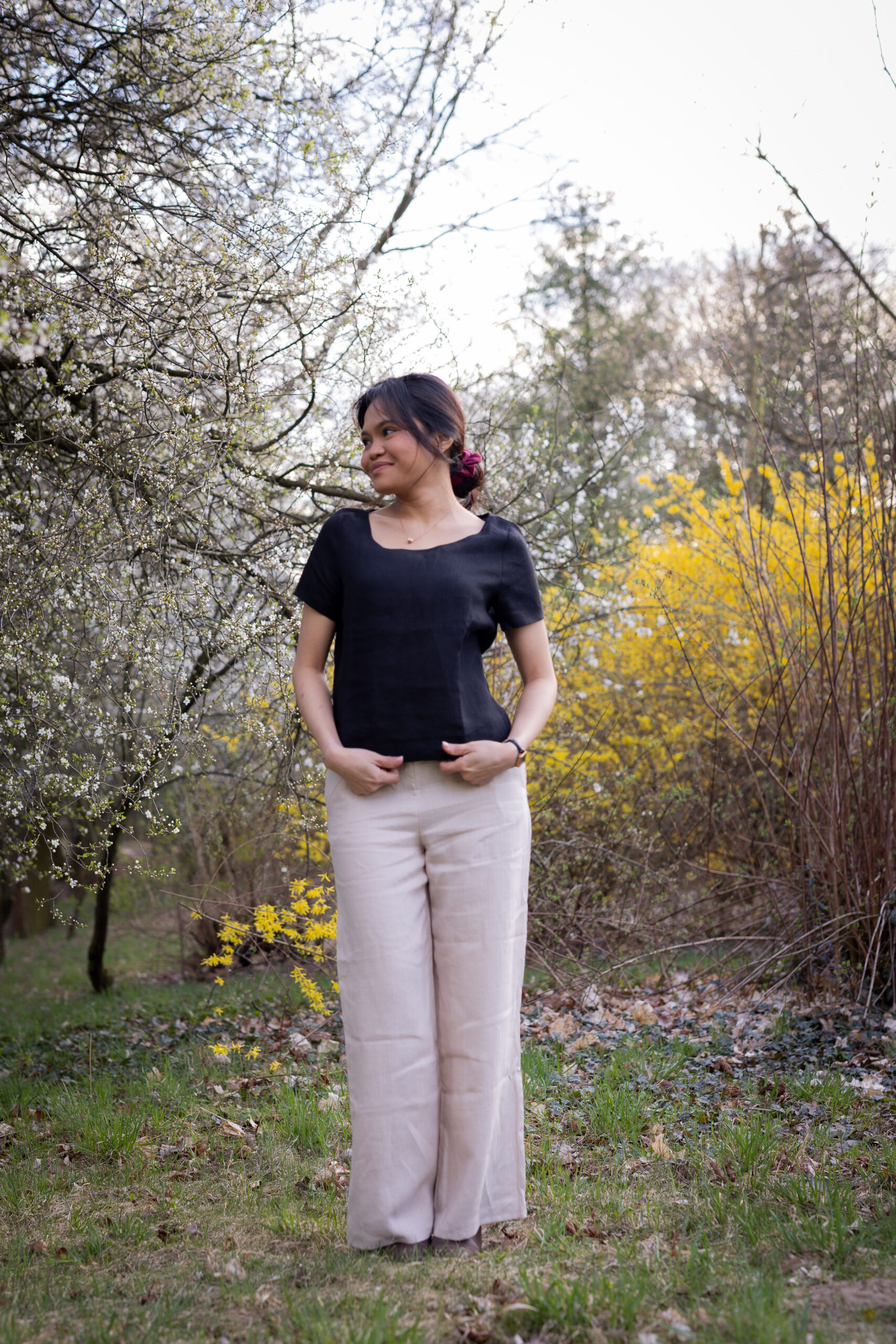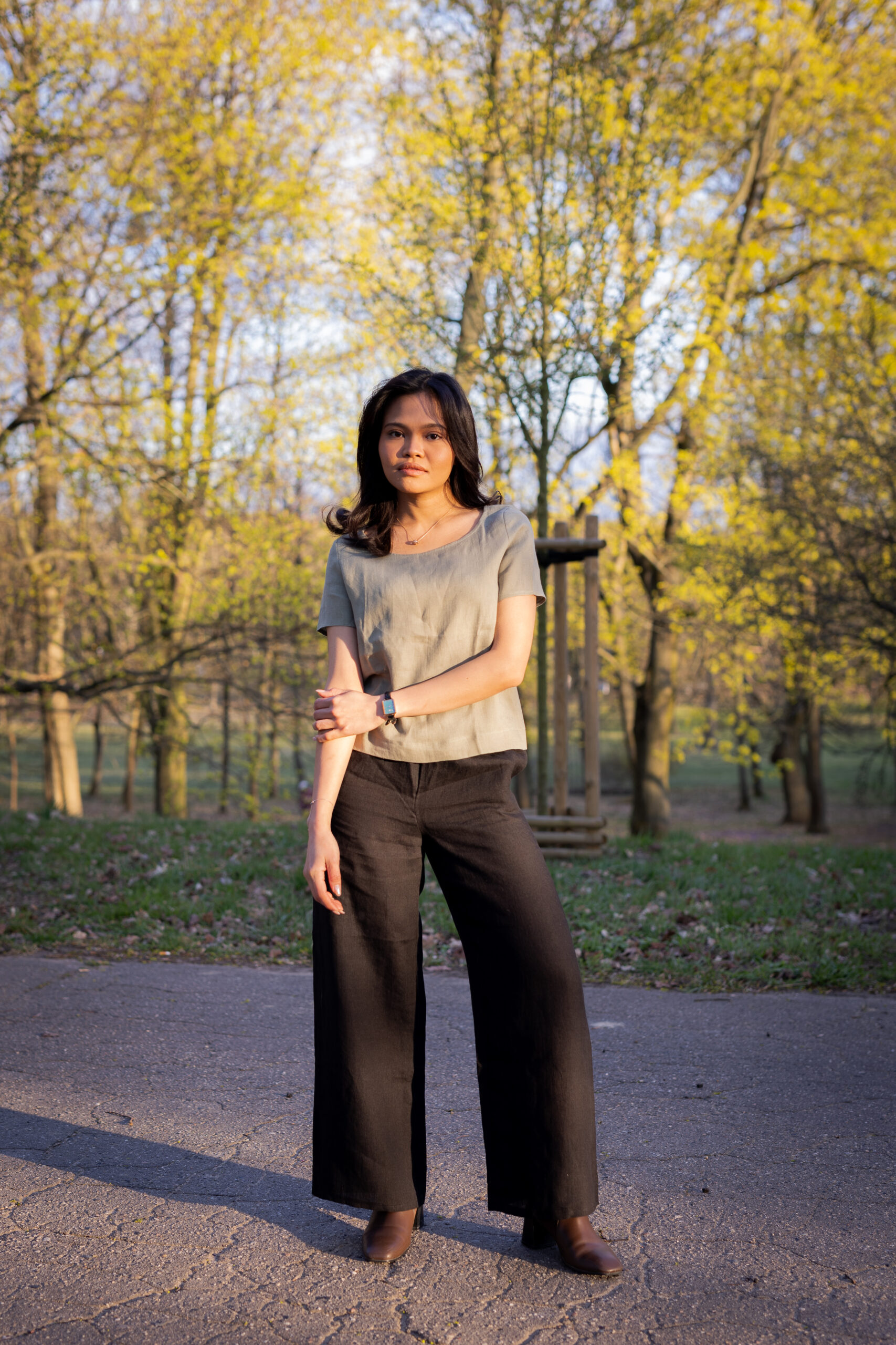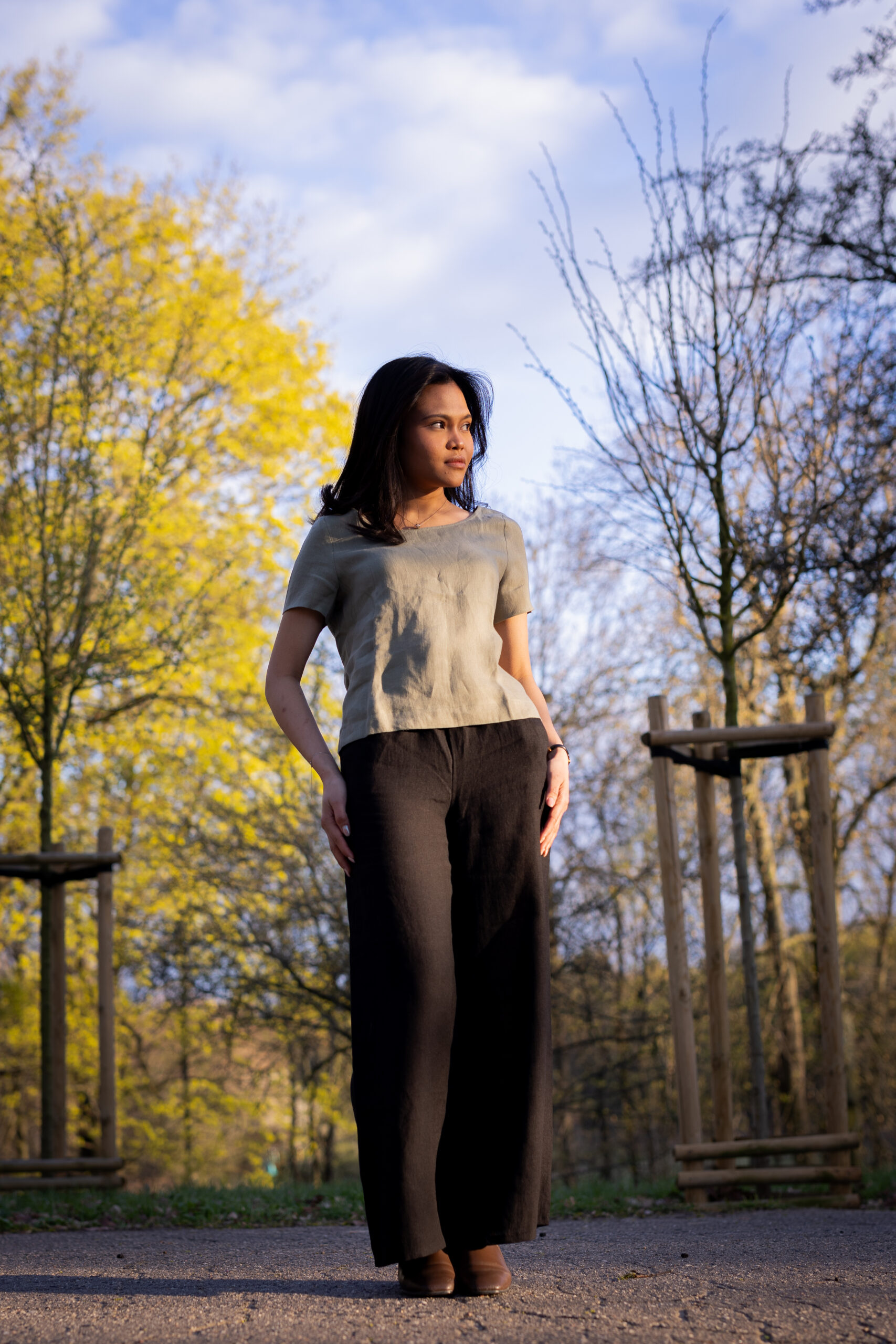 Można nosić je z prostym topem, t-shirtem lub jako komplet z lnianą koszulką z krótkim rękawkiem.